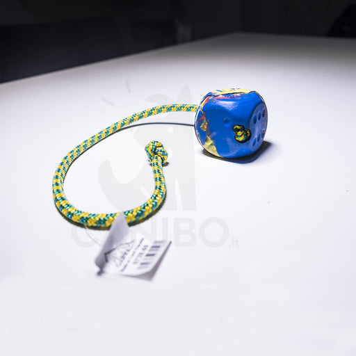 Cubo in gomma con corda. Un'ottima alternativa alla classica pallina da utilizzare come premio per le sessioni di gioco e obbedienza. Dimensione: l...
